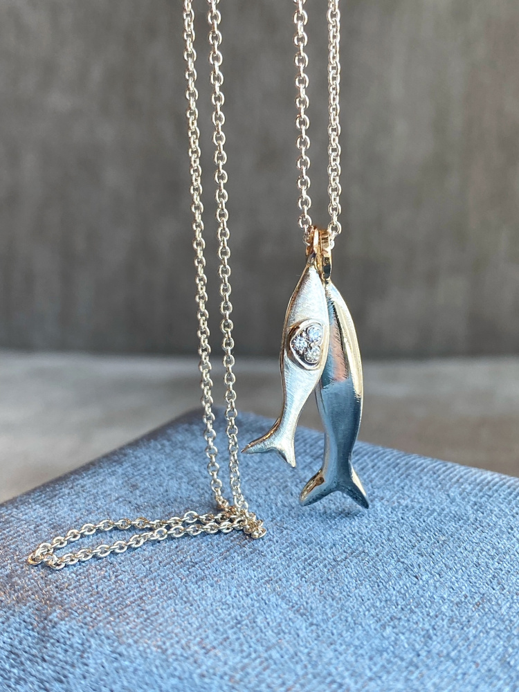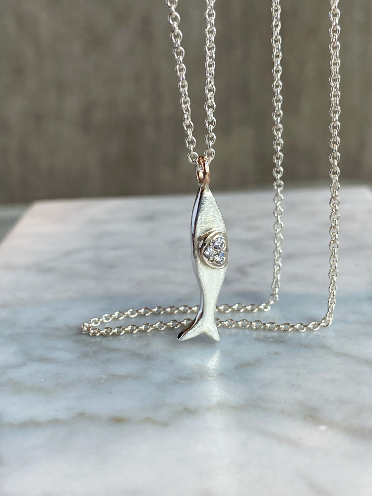 One of a kind, Catch of the day! Lykkefisk i sølv med gullhjempe og diamanter. Total lengde ca 25 mm.